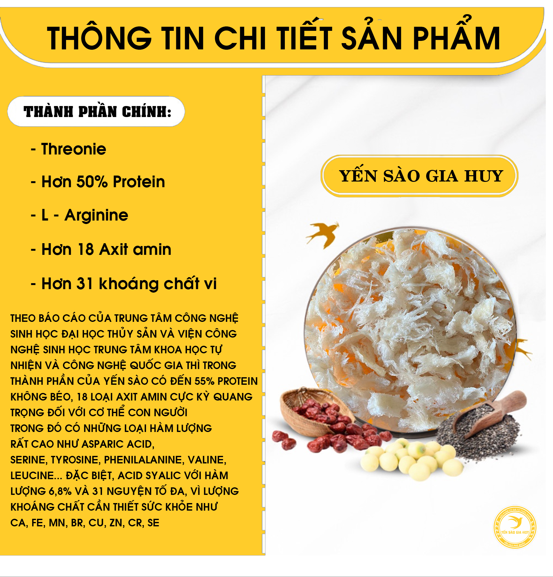 Yến Sào Gia Huy trực tiếp thu hoạch và vận chuyển tới xưởng tinh chế trực tiếp yến sào nên luôn có giá cả tốt nhất thị trường, chất lượng sản phẩm luôn luôn được shop ưu tiên hàng đầu như: Tổ yến, yến sào phú quốc, tổ yến thô, yến tinh chế, yến chưng sẵn. Thương hiệu uy tín lâu năm luôn cam kết về chất lượng, dịch vụ, được hơn 60.000 khách hàng là các doanh nhân, sao việt tin tưởng lựa chọn các dòng sản phẩm bồi bổ, chăm sóc cho sức khoẻ, quà biếu, quà tặng cao cấp.